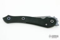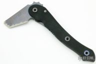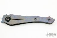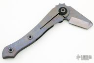 This Pocket Axe framelock folder by Warren Thomas features a chisel ground finger print anodized titanium blade with a carbide edge. The handle has a black G10 and finger print anodized titanium frame with black G-10 pivot accent on the titanium side.  In the open and locked position, the blade is perpendicular to the handle, like a hatchet or tomahawk.  Nice lockup, detent and blade seating. Has some light scratches, otherwise excellent condition.
