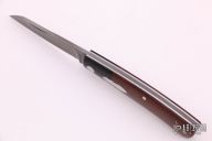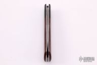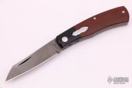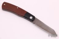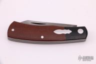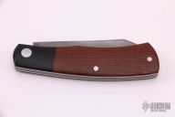 This "Native" pattern custom slipjoint from Jim Dunlap features a sheepsfoot style blade with a single nail nick. The handle is comprised of black canvas micarta bolsters, brown canvas micarta covers with stainless steel escutcheon, pins and liners, steel backspacer. Flush in the closed, half stop and open position. Has a few light scratches, otherwise excellent condition.