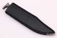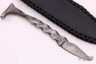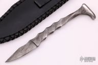 This knife by Master Smith Steve Schwarzer features a Damscus blade with spiral fluted handle, .201" blade stock and .642" blade depth, integral construction. This knife is stamped on the butt with "SCHWARZER". Has a little patina, otherwise excellent condition. Comes with black leather sheath, not original to the knife, but it fits nicely.