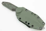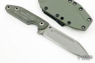 This Dauntless Fixed Blade by Kingdom Armory features a bead blast finished blade with notched thumbrest and fullers, .252" blade stock and 1.296" blade depth, full tang construction. The handle has green G-10 scales. Comes with a green kydex sheath with TekLok. Excellent condition. Signed and dated on tang.