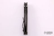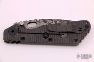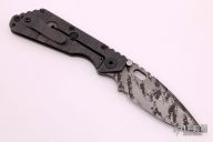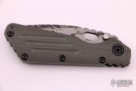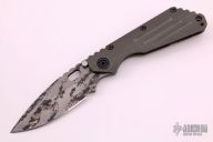 This SMF by Strider Knives is a TAD Gear Edition features a digicam finished blade with notched thumbrest, thumbhole, and dual thumbstuds. The handle has a green G-10 and a flame finish titanium handle with matching tip up titanium clip. Includes Hinderer "Lock Bar Stabilizer" for maximum reverse lock retention. Nice detent, lockup and blade seating. Has a few light scuffs, otherwise excellent condition.