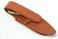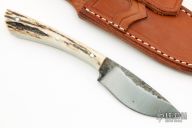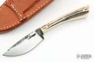 This knife by Lon Humphrey features a hand forged blade with satin finished grinds and forged finished flats, has integral flanged guard, .174" blade stock and .989" blade depth, full tang construction. The handle has stag scales with nickel silver pins. Comes with a brown leather sheath. Has a few light scratches and some patina, otherwise good condition.