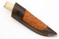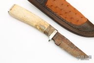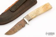 This Hunter by Herb Derr features a Random Pattern Damascus blade with fileworked spine, .145" blade depth and 1.098" blade depth, hidden tang construction. The handle is comprised of a nickel silver guard and pommel with a maple burl and nickel silver spacer and a walrus jaw bone grip. Includes a brown leather sheath with ostrich skin inlay. Excellent condition.