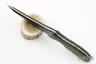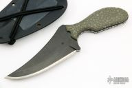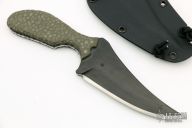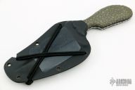 This knife features a titanium and carbon fiber laminated blade with carbidized edge, .281" blade stock and 1.678" blade depth, full tang construction with textured green G-10 scales. Comes with a kydex sheath. Excellent condition.