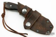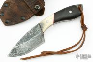 This Skalpr by Vorn Knives features a drop point blade with a forge finish, .149" blade stock and 1.414" blade depth, full tang construction. The handle has stag bolsters with cocobolo scales with red liners. Comes with a brown leather sheath. Excellent condition.