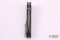 - Smooth G10 or carbon fiber slabs on the handle are crafted with a flared boat tail and the stonewashed blade with blackened hardware and two-piece titanium pocket clip complete the knife’s almost mystical aesthetic.