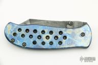 This Medium Puffin framelock folder by Chuck Gedraitis features a clip point blade with hamon and single thumbstud. The handle has an anodized titanium frame and tip up titanium clip. Nice blade seating, detent, and lockup. Has some scuffs and some oxidation on the blade, otherwise good condition.