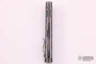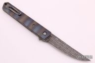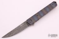 This Kwaiken flipper by Lucas Burnley features heat colored titanium scales and backspacer, stonewashed titanium liners, tip up titanium clip. The blade is "Whiplash" pattern Damascus flip a flipper. Has the IKBS bearing system and is a very smooth and fast flipper that requires no wrist action. Has some scuffs/scratches, otherwise excellent condition.