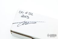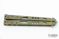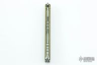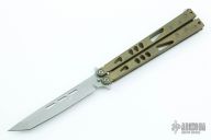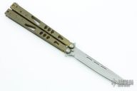 This Tachyon II balisong from Microtech has a stonewashed, tanto blade with swedge. The handle is comprised of skeletonized bead blast brass handles with aluminum T latch on pommel. Includes box and paperwork. Dated 07/2013. Marked 50/52 on the box. Excellent condition.