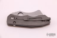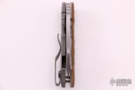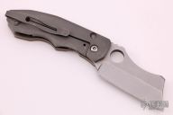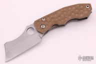 This "Bill The Butcher" framelock folder by Kingdom Armory features a cleaver style blade, notched thumbrest and thumb hole. The handle has a tumbled titanium frame with a textured coyote brown G-10 scale, titanium tip up clip. Nice detent, lockup and blade seating. Has some scuffs/scratches, otherwise good condition.