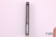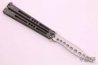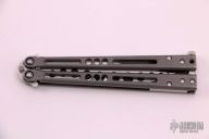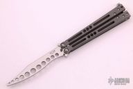 This Prodigy Trainer Balisong from Jerry Hom features a satin finished recurve blade with hole pattern. The handle is comprised of bead blasted titanium handles with satin titanium backspacers. Includes original box and papers. Has scuffs and scratches, has a crack in the blade between the stop pin and the first cut out hole in the blade, poor condition.