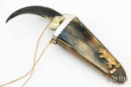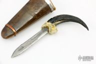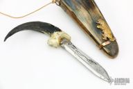 This knife features a drop point blade with a hidden tang construction.  .076" Blade Stock.  .49"Blade Depth.  The handle is made of replica eagle claw.  The scabbard is made of fossilized mammoth ivory with bronze, copper and silver ascents.   New from maker!