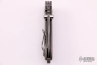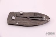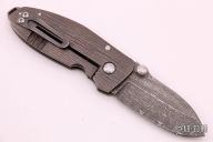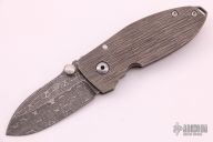 This Squid frame lock folder by Lucas Burnley features wood grain carved titanium handle. Tumble finish Damascus blade with dual thumb studs and notched thumbrest. Tumble finish backspacer with thong hole. Strong lock up, nice detent and blade seating is dead center. Originally from the NYCKS 2012. Has been carried, and has a couple marks on the blade, otherwise excellent condition.