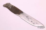 I ordered ready made blades and put handles on them for years. I was poor and lived on my houseboat in the Alaska wilds. I learned a lot about ?materials? for handles and this was more my specialty. Out of necessity I had to fix things, build things, as I was out of touch for up to 8 months without seeing anyone. I had to combine various materials and make them strong with internal pins, wrappings etc. I had to understand what could withstand heat, water, sharp blows, internal stress. I lived with animal parts and began selling to knife makers, selling bone, antler, horn, claws, teeth, fossils, ivory etc. Living on a boat and traveling the wild I knew natives all over the state who trusted me and traded with me. I got mammoth tusks, grizzly claws and sometimes hard to get record materials the civilized world never gets to look upon. I always sold knives off and on over the years, but did not work the steel as I was just not set up for it. I thought for years it was too complicated. My first attempt in a woodstove did not work and I warped the blade. Custom blades friends made broke.
