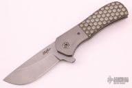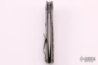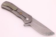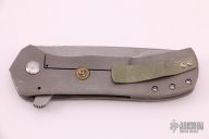 This Recon flipper by Doc Shiffer features a stonewashed blade with notched thumbrest. The handle has a tumbled titanium bolster with green G-10 scale on one side and tumbled titanium scale on the other with bead blasted and anodized titanium clip, tip up carry, and a "9mm LUGER WIN" shell casing as the lock-bar stabilizer. Nice detent and lockup. Has some light scuffs, otherwise excellent condition.