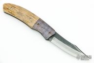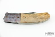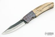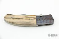 This is a Special Folding Knife by Shosui Takeda, with a handle by Kansei Matsuno. The blade is Aogami Super Steel (AS) which is a high-carbon steel alloy with vanadium and is ground on both sides. The handle has colored mosaic Damascus bolsters, mammoth ivory scales, anodized titanium liners and a stainless steel backspacer. Has some light scratches and a little patina on the blade, otherwise good condition.