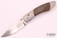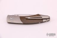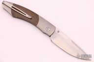 This TAD Gear Edition B12 by William Henry features a hand rub satin finished blade, San Mai with ZDP-189 core. The handle has a bead blasted titanium frame with green canvas micarta inlays and a tip up titanium clip. The button and thumbstud have an amber colored stone set in a gold bezel. Has some light scuffs and scratches, otherwise good condition.