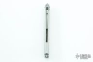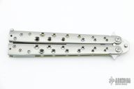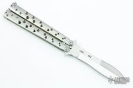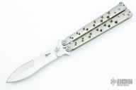 This Model 4 Balisong by Korth Cutlery features a spear point satin finished blade with sharpened top edge. The handles are orange peel finished titanium with anodized insides, has t-latch. #032 on the blade. Has some light scuffs and scratches, otherwise excellent condition.