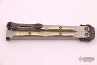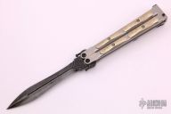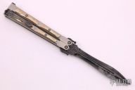 This Daguhoy "Hero's Balisong" by Pabu Knives features a Jim Ferguson twisted Damascus spear point double-edged hollow ground blade with pronounced fuller and with fileworked and engraved ricasso. Milled "super-alloy" titanium channel handles with Thomas Mokume inserts and Ferguson Damascus screws, pocket clip and T-latch. Historically significant object and true masterpiece of one of the founding fathers of custom balisong design, engineering, and creation. This is a special knife, with its own dedicated webpage accessible at the following address: