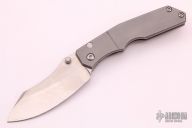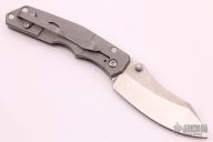 This custom Samaritan folder by Kingdom Armory features a satin finished blade with dual thumbstuds. The handle has a bead blasted titanium frame with matching tip up clip. Nice detent, lockup and blade seating. Has some light scuffs and scratches, otherwise excellent condition.