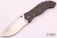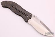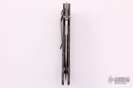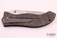 This full-size Resurrection frame lock folder by Jim Burke features a spear point recurve satin finished blade with single skull thumbstud and notched thumbrest. The handle is flame anodized and bead blasted titanium with anodized titanium pocket clip, tip up carry, reversible, and titanium barrel spacers. Nice detent, lockup and blade seating. Has some scuffs and scratches, otherwise good condition.