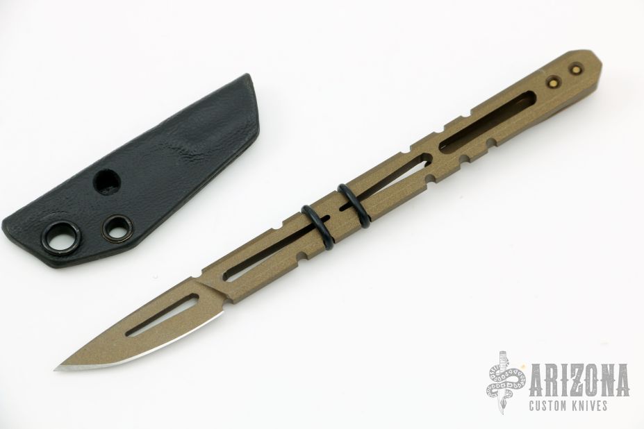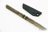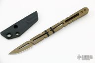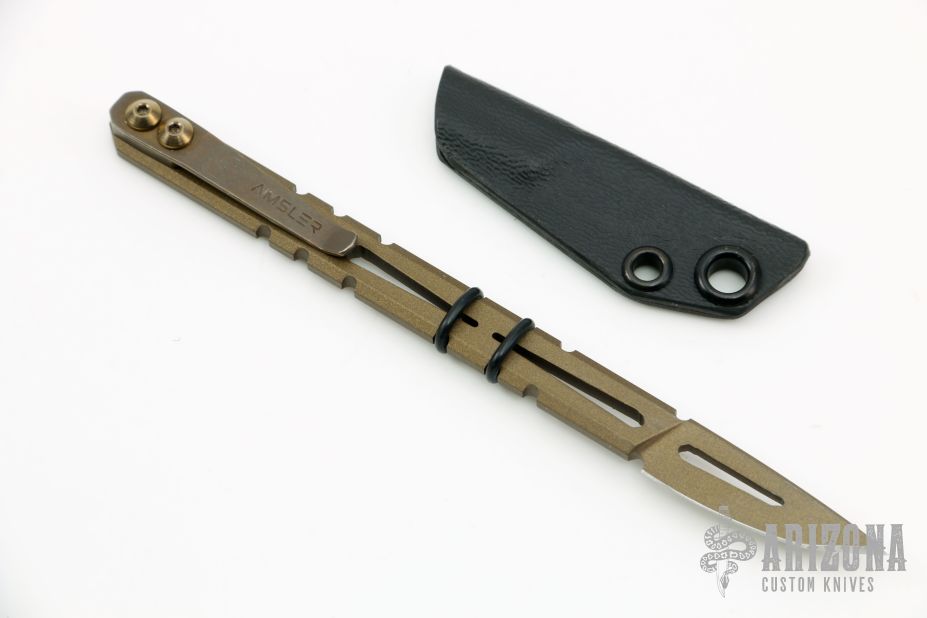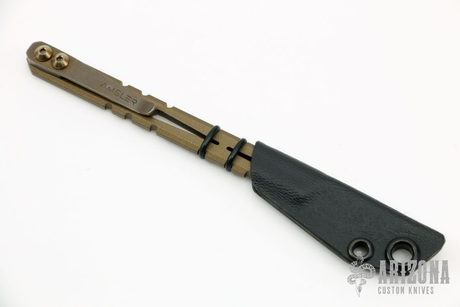 This Hurricane Razor from Amsler Knives features a burnt bronze cerakoted CPM 154 handle/blade. This unique piece has a removable, discreet, pocket clip. Screws and clip are anodized titanium. Sharpened portion fits securely into a kydex sheath. Knife can be carried in a shirt pocket because of it's small/discreet nature. Excellent condition.
