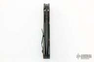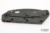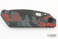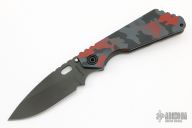 This SMF by Mick Strider features a black blade with thumb hole and notched thumbrest. The handle is comprised of a black/red/gray camo coated aluminum and flamed titanium with matching titanium clip and Hinderer "Lock Bar Stabilizer" for maximum reverse lock retention. New condition.