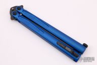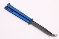 This Tachyon III balisong by Microtech Knives has a DLC finished blade with false top edge. The handles are integral blue aluminum with spring latch and tip up stainless steel clip, all black hardware. Includes original box and papers. New condition. Dated 03/2017 and s/n 01624