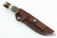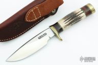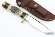 The Model 25-5 by Randall Made Knives is a drop point hunter similar to Model 11, but handle construction is reminiscent of 1930′s design. Excellent skinning, outdoors knife. This knife has a satin finished blade with notched thumbrest, .194" blade stock and 1.24" blade depth, hidden tang construction. The handle has a brass guard/pommel, stag grip with stacked leather, black and brass spacers. Comes with brown leather sheath. Light scratches are visible on the handle otherwise the knife is in excellent condition.
