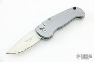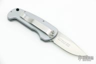 This Sidekick by Protech knives features a satin finish clip point blade with grey aluminum handle, stainless release button and clip positioned for tip up carry. Comes with original box. Marked Pre-Production. Has some light scuffs and scratches, otherwise excellent condition. Very early piece.