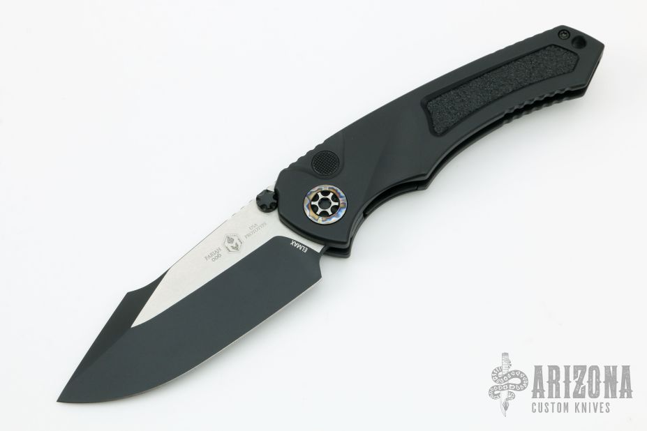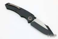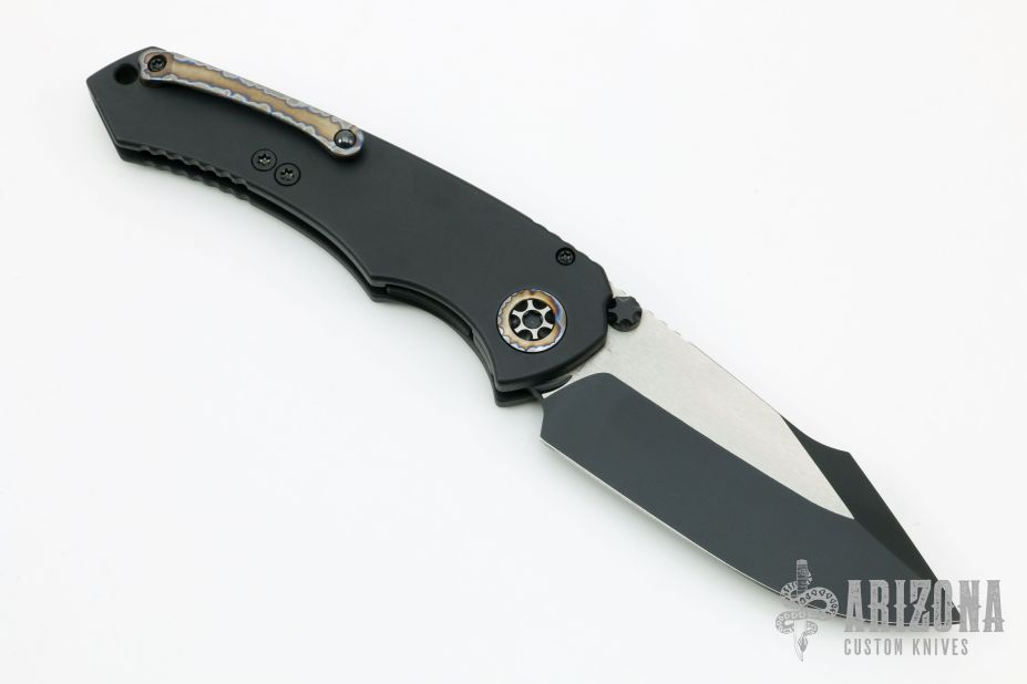 This D/A Pariah Prototype by Heretic Knives features a two-tone blade with notched thumbrest and dual thumbstuds. The handle has a black aluminum frame with non-slip inserts, flamed titanium pivot collars and tip up clip with ceramic ball. Comes with original box. Excellent/new condition. The box is signed and #6. This knife is #006.