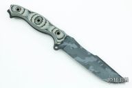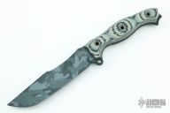 This P&L Statement by Busse features an urban multicam coated clip point blade with .220" blade stock and 1.375" blade depth, full tang construction. The handle has black/tan G-10 scales with a lanyard hole at the butt. New from maker. Arizona Custom Knives Exclusive.