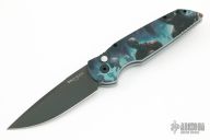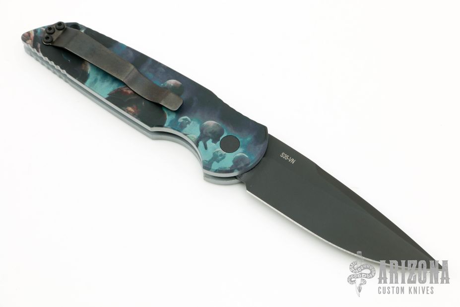 This Tactical Response TR-3 by Pro-Tech black anodized aluminum body, which provides good traction and looks great. The blade is black finished 154-CM stainless steel with a plain cutting edge. The TR-3 is a knife that won't let you down. It fires hard, locks up like a rock, and feels great in hand. The slim design sits comfortably for tip-up pocket carry. Abalone inset in the firing button, adding a unique and awesome flare to the piece. Excellent condition.
