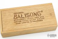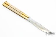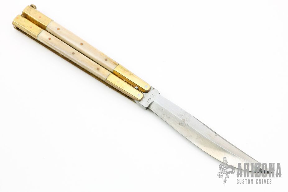 This Balisong features brass fittings and bone scales. Satin finished blade with false top edge. Hand made in Philippines. Comes with original box and sheath. Has some scratches, otherwise good condition.