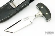 This push dagger by Ed Martin features a mirror polish finished tanto blade with false top edge, .198" blade stock and 1" blade depth, full tang construction with black/green canvas micarta scales. Comes with a leather sheath. Has some light scuffs and scratches, otherwise excellent condition.