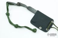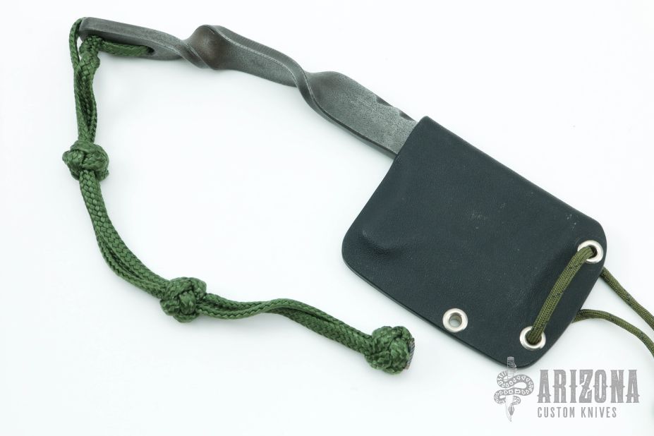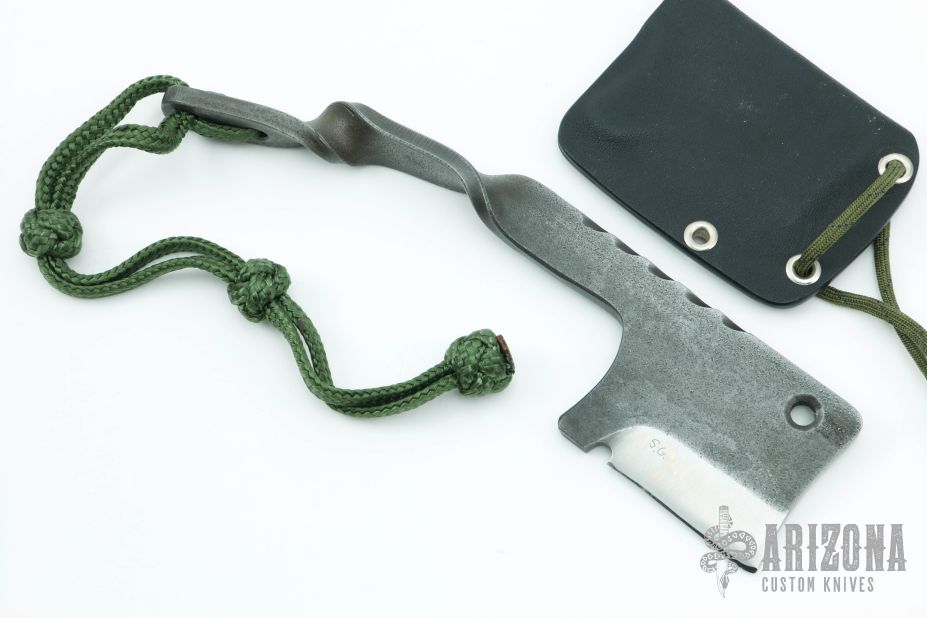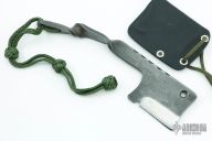 This custom cleaver features an acid etched finish and satin grinds. File work on spine and twisted steel handle with Mil-Spec Kermandle hand tied lanyard. 1/4' blade stock and 2 1/4" blade depth. Includes black kydex sheath. Excellent condition.