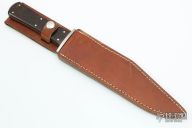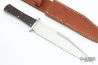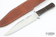 This bowie from A.G. Russell features a satin finished blade with a false top edge, .175" blade stock and 1.642" blade depth, full tang construction. The handle has a stainless steel guard, desert ironwood burl scales with red liners. Comes with original brown leather sheath with belt loop. Excellent condition.