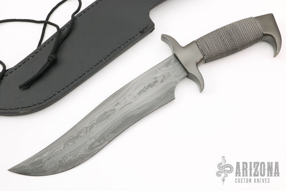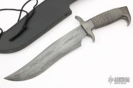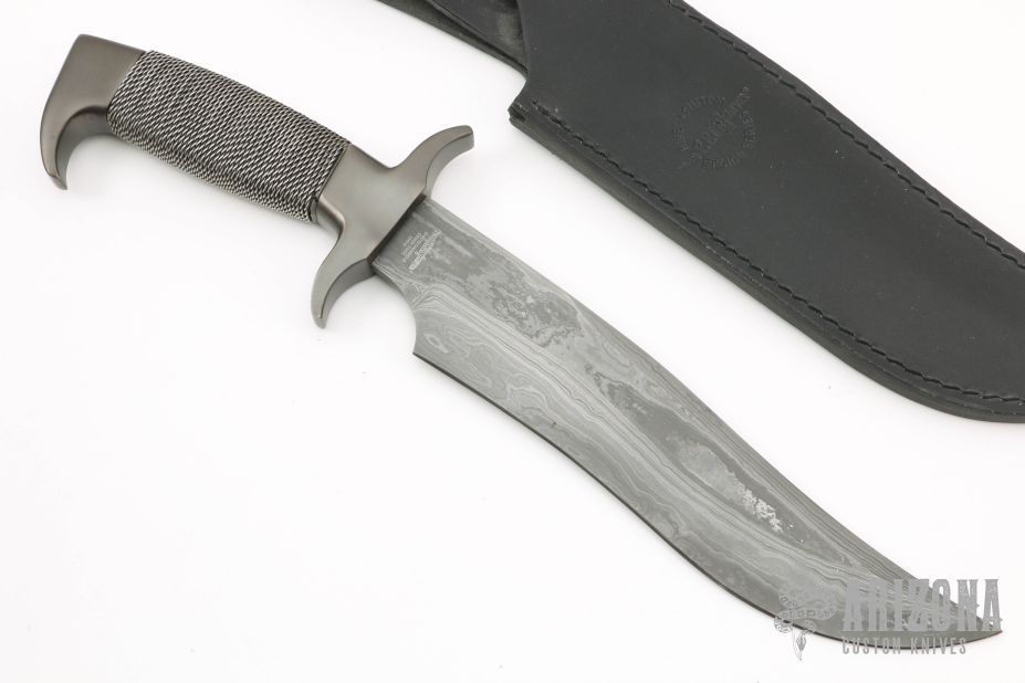 This classic stainless masterpiece was designed with the ancient highlanders in mind. The 1,248 layer Damascus steel blade features a solid metal hand guard and pommel with a stainless wire-wrapped handle for a sleek grip. Includes a leather snap closure belt sheath. Comes with original box and papers. Excellent condition.