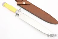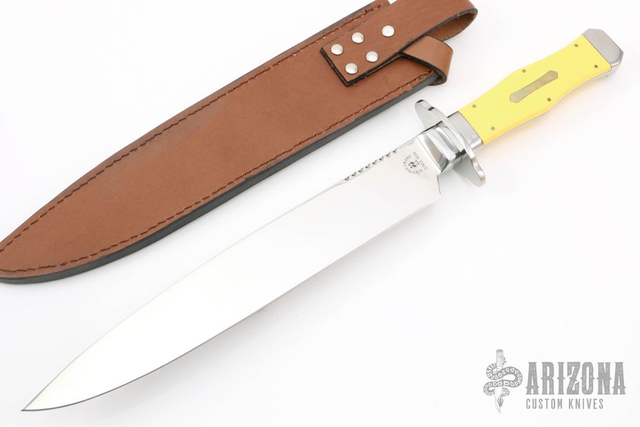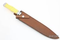 This Bowie by Kissing Crane features a mirror polished blade with fileworked spine, .157" blade stock and 1.595" blade depth, hidden tang construction. The handle has a stainless steel guard and frame with yellow scales and nickel silver escutcheon. Comes with a brown leather sheath and original box. Excellent condition.