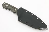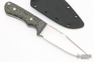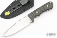 This knife by Steve Frist features a satin finished blade with a fileworked thumbrest, .149" blade stock and 1.376" blade depth, full tang construction. The handle has textured black linen micarta scales with stainless steel pins. Comes with a kydex sheath with Ulti-Clip. New from maker.