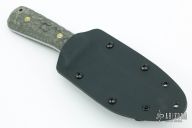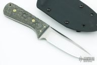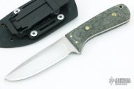 This knife by Steve Frist features a satin finished blade with a false top edge, .149" blade stock and 1.178" blade depth, full tang construction. The handle has textured black canvas micarta scales with brass pins. Comes with a kydex sheath with a belt clip. New from maker.