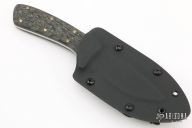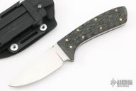 This knife by Steve Frist features a satin finished blade with a fileworked thumbrest, .142" blade stock and 1.162" blade depth, full tang construction. The handle has textured black linen micarta scales with brass pins. Comes with a kydex sheath with a belt clip. New from maker.