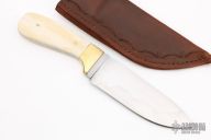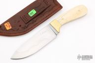 This knife by Steve Frist features a hand rub satin finished blade with a nice hamon, .146" blade stock and 1.546" blade depth, full tang construction. The handle has brass bolsters, giraffe bone scales with brass pins. Comes with a hand tooled brown leather sheath with a belt loop. New from maker.