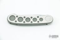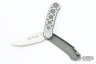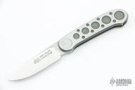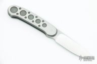 This knife by Mike Irie and Barry Wood polished blade with a two-tone stainless steel handle. Opens and closes like any other swing lock folder. Has some light scratches, otherwise excellent condition. Comes with original box and COA. #019516 inside frame and on COA.