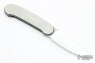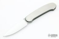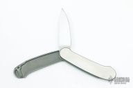 This knife by Barry Wood polished blade with a two-tone stainless steel handle. Opens and closes like any other swing lock folder. Excellent condition.