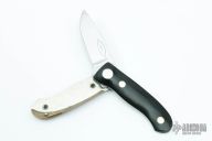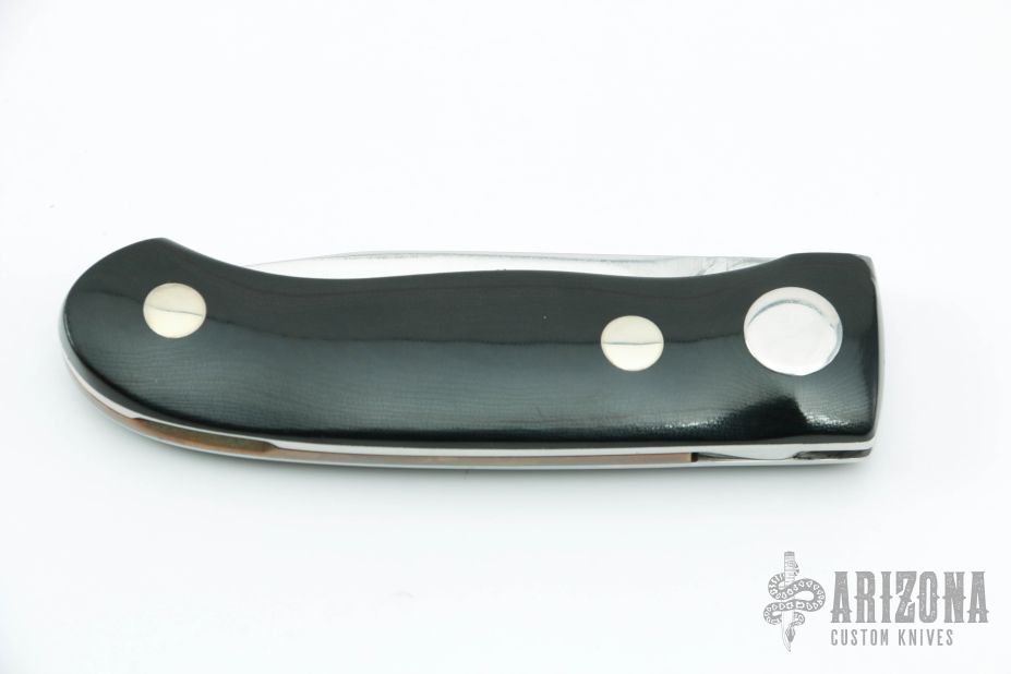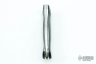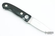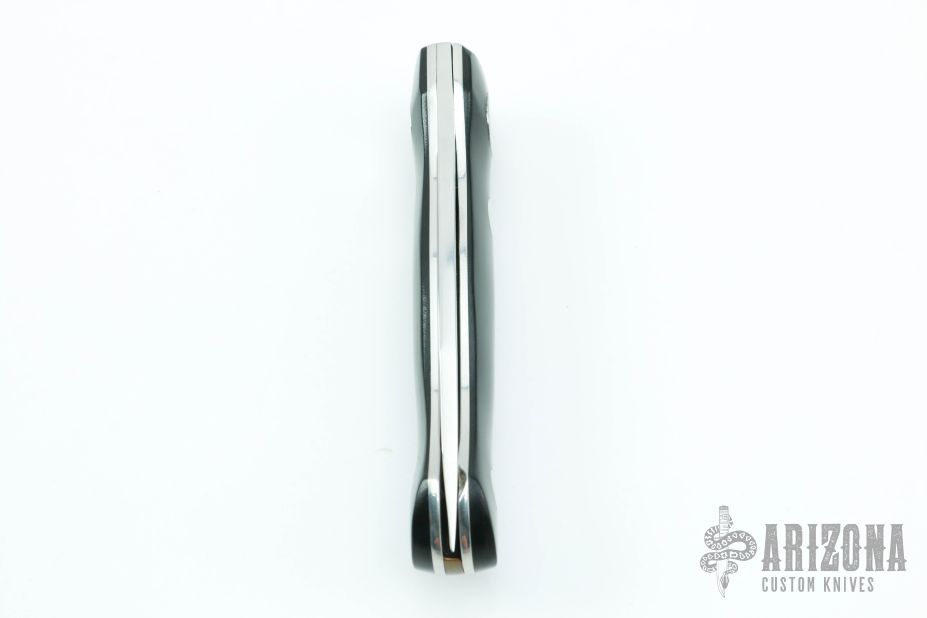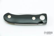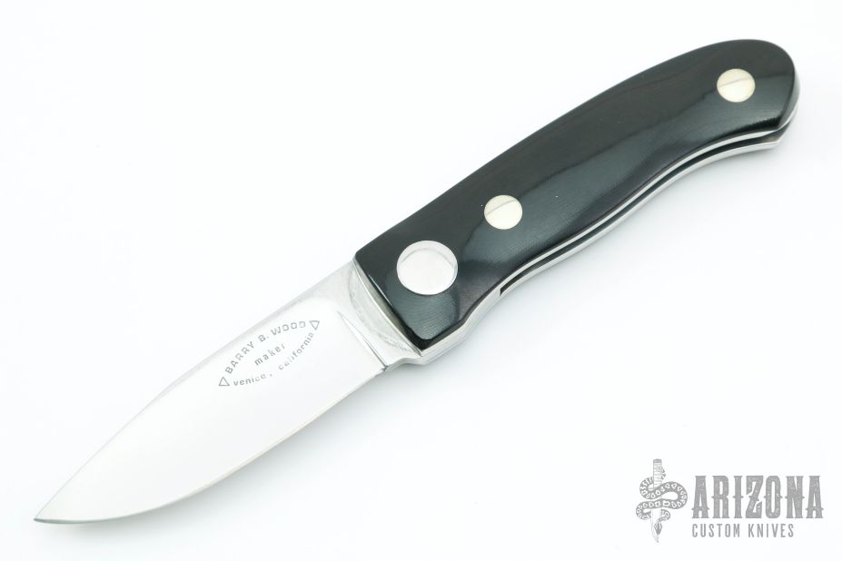 This Barry Wood Swing-Lock features a polished blade and black linen micarta scales. Stainless frame and brass backspacer. This is a very unique scissor opening folder, which, when the blade is fully open and locked in place, almost feels like a fixed blade knife. The handle is nicely contoured for a comfortable grip. Opening is accomplished by lighting pressing down and outward at the rear indentation on the spine, which releases the locking pin and allows one side of the handle and the blade to rotate down then forward until the blade locks in the forward position. The one side of the handle continues to rotate back until it locks in place. Closing requires the same slight thumb pressure at the indentation to release the locking pin, then the one side of the handle is rotated back and around, catching the blade and aligning both with the other side of the handle in a locked closed position. #093 on the inside of the handle. Has a few light scratches, otherwise excellent condition.