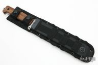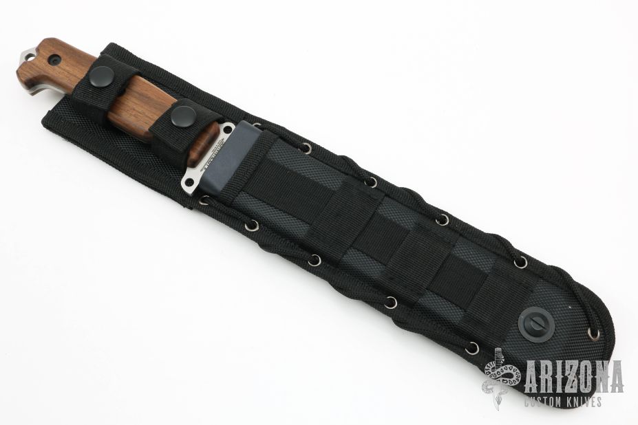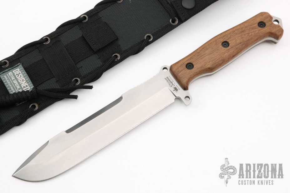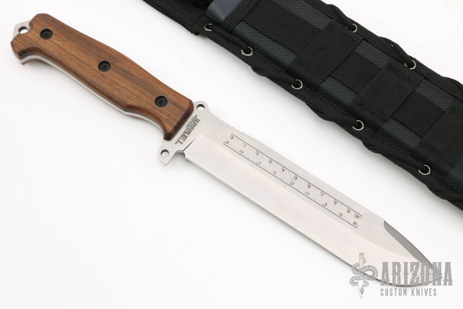 This knife by Kizlyar Supreme features a tumble finished blade with notched thumbrest, has a ruler on one side of the blade, .187" blade stock and 1.465" blade depth, full tang construction. The handle has walnut scales. Comes with black nylon sheath and original box. Excellent condition.