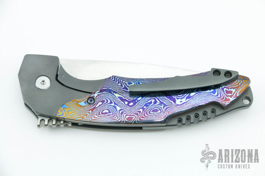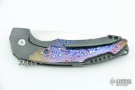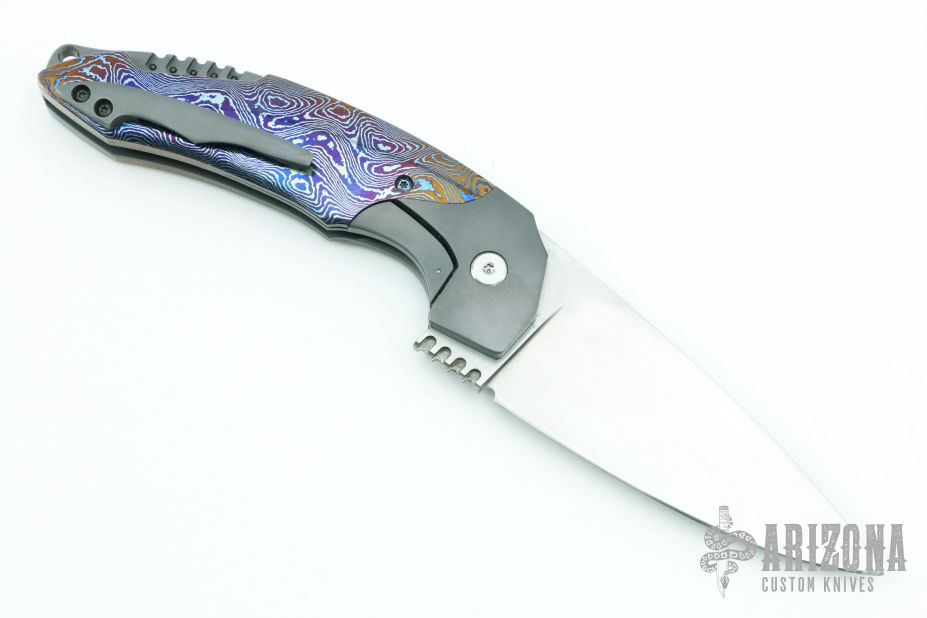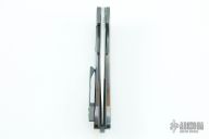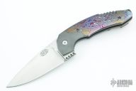 This Maximus by Thierry Savidan features a hand rub satin finished blade with notched flipper. The handle is composed of bead blasted titanium bolsters with integral liners, nicely contoured mokuti scales, titanium backspacer with ceramic ball inlays, tip up titanium clip with, stainless lockface insert with over travel stop. Rides on bearings, nice detent, lockup and blade seating. Excellent Condition. Comes with a zippered case.