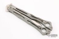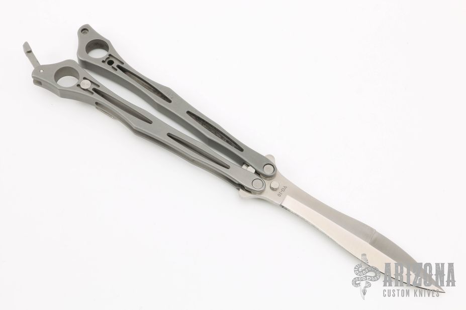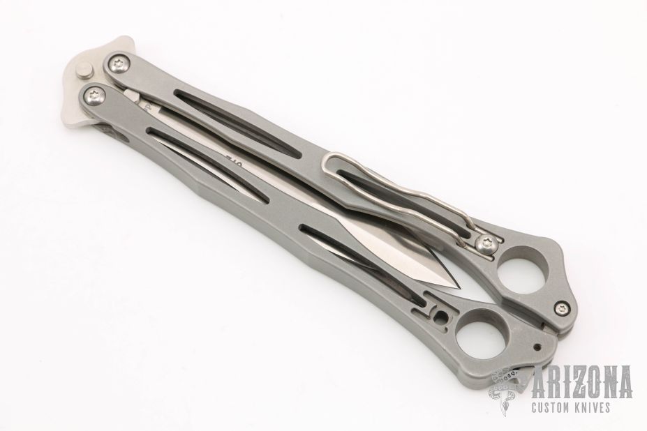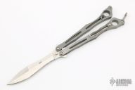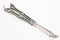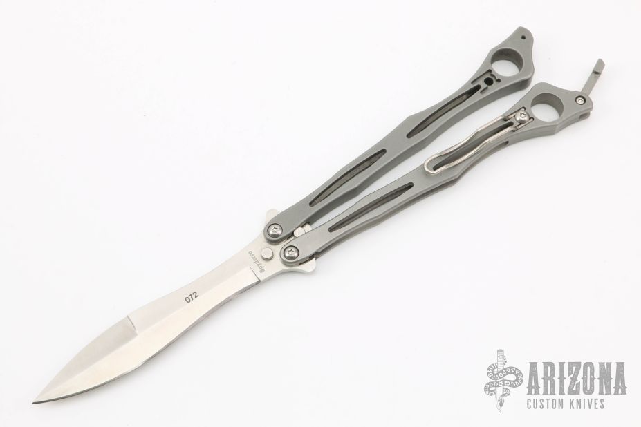 This Spyderfly Balisong by Spyderco features a satin finished spear point VG-10 blade with a false top edge. The handles are bead blasted stainless steel with a tip up clip (4-way reversible). Has a few light scuffs, otherwise excellent condition.  Comes with original box and papers.