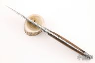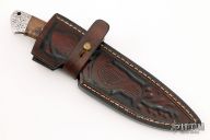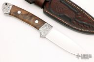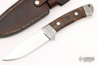 This Drop Point Hunter by Shawn Smith features a mirror polished blade with .188" blade stock and 1.186" blade depth, full tapered tang construction. The handle has engraved stainless steel bolsters, walnut scales with black spacers/liners, engraved tang spine. Comes with a hand tooled brown leather sheath and a hand carved wooden display box with brass latch. New from maker.